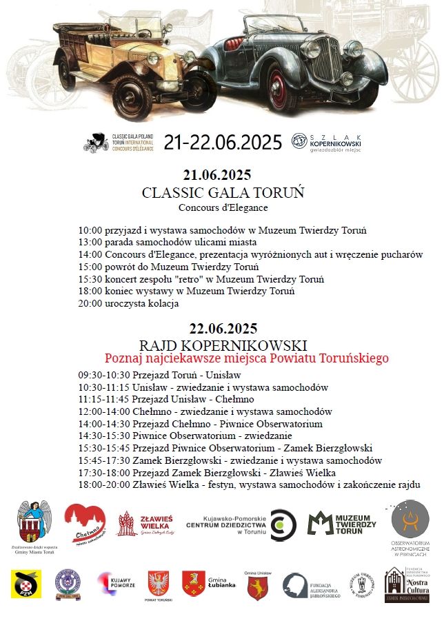 Posiadaczy pojazdów zabytkowych zapraszamy do uczestnictwa, a mieszkańców i turystów do podziwiania i zabaway w miejscach i godzinach umieszczonych na plakacie.